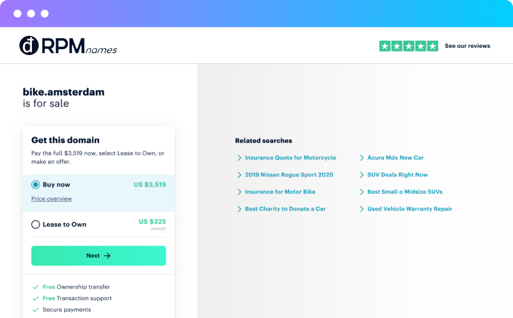 List your domain for sale or lease-to-own. Or accept offers. In mere minutes.